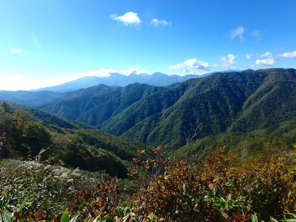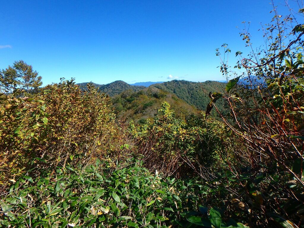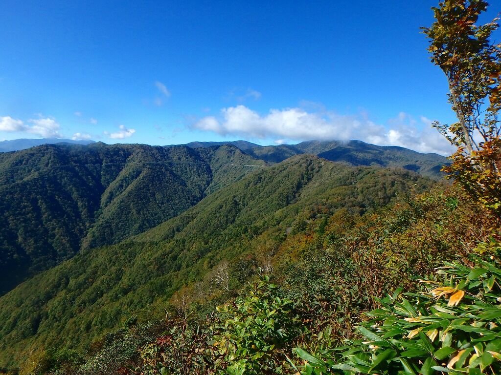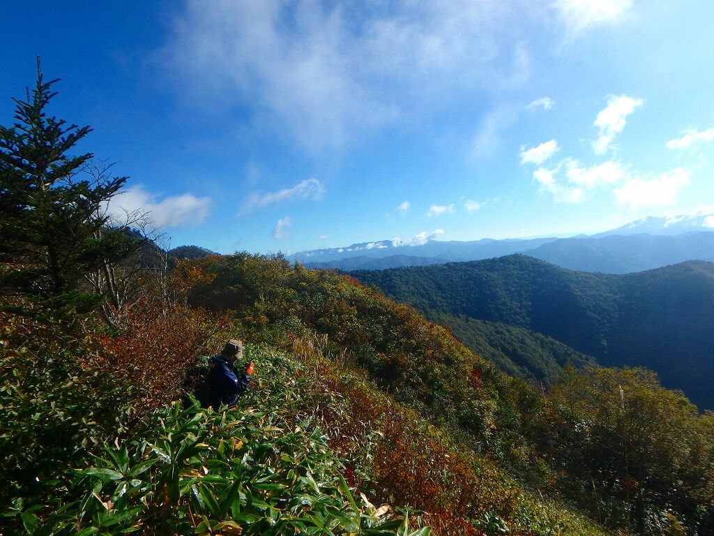 すっかり晴れ上がり展望がいい。目指す峠・林道はこうしてみるとまだ遠く。歩きにくくなったら福島側で獣道を。