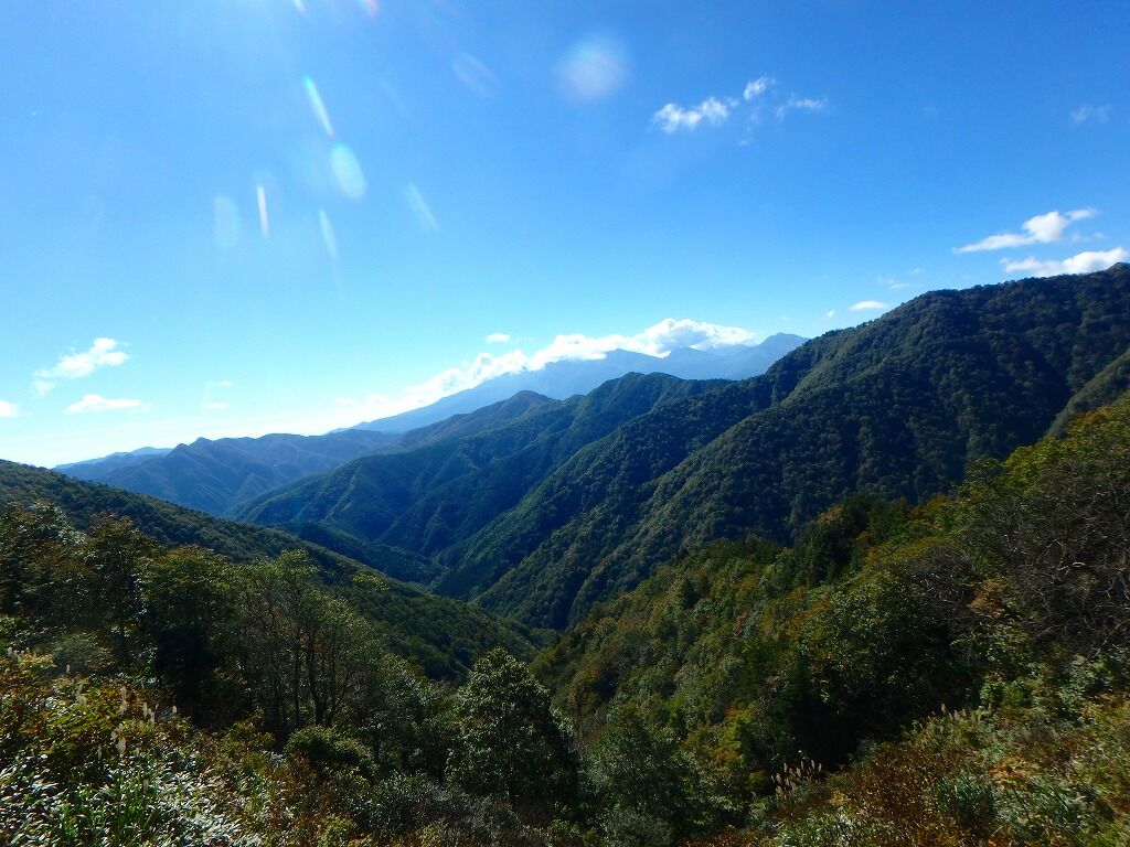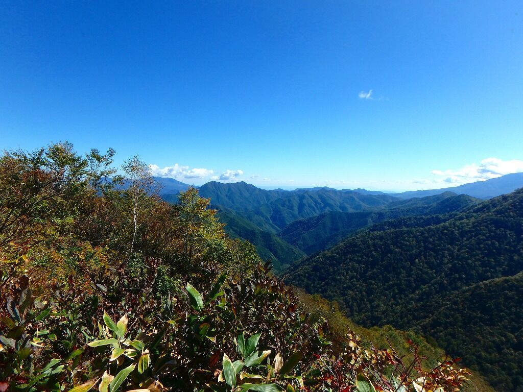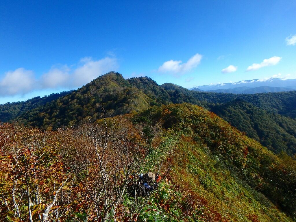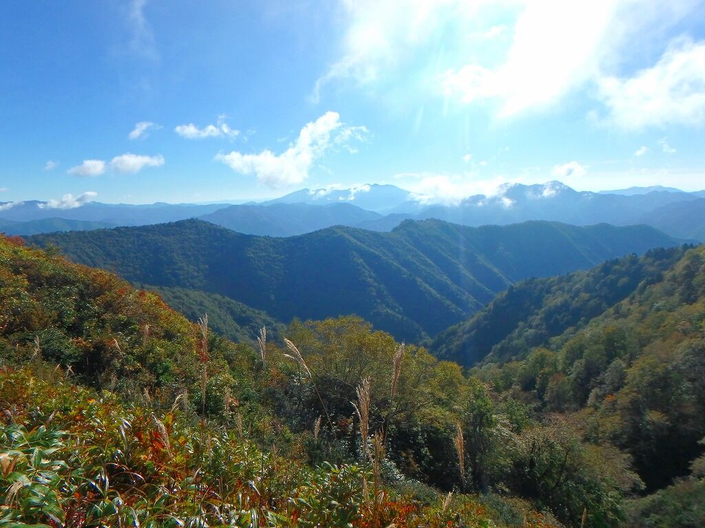 すっかり晴れ上がり展望がいい。目指す峠・林道はこうしてみるとまだ遠く。歩きにくくなったら福島側で獣道を。