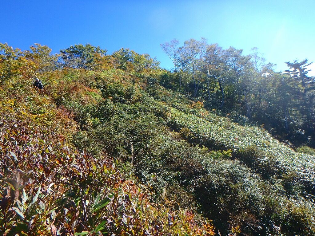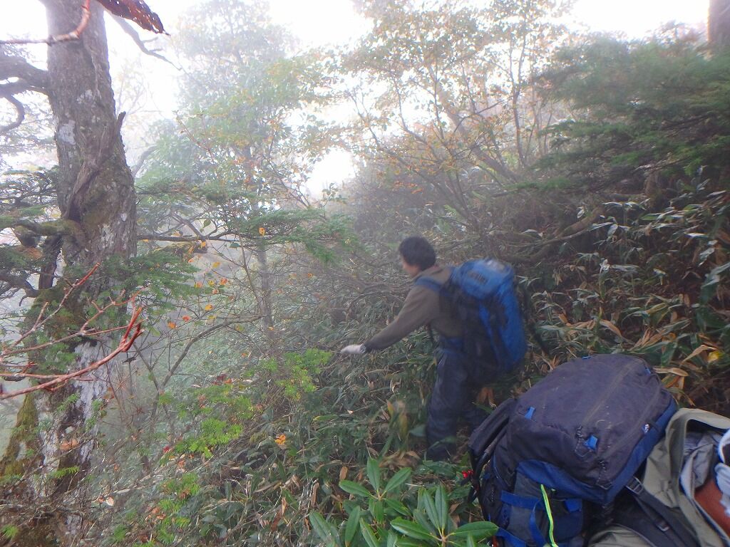 登山道だったら挨拶して素通りであるが、こんな藪中で出会ったら予定ルートを訪ねるのが礼儀というもの。それにこんなところに来るもの好きなんて一体全体どこのだれなんだ・・・と普通なら思うところであるが実のところ僕にはこのタイミングで出会う人物に心当たりがあった。