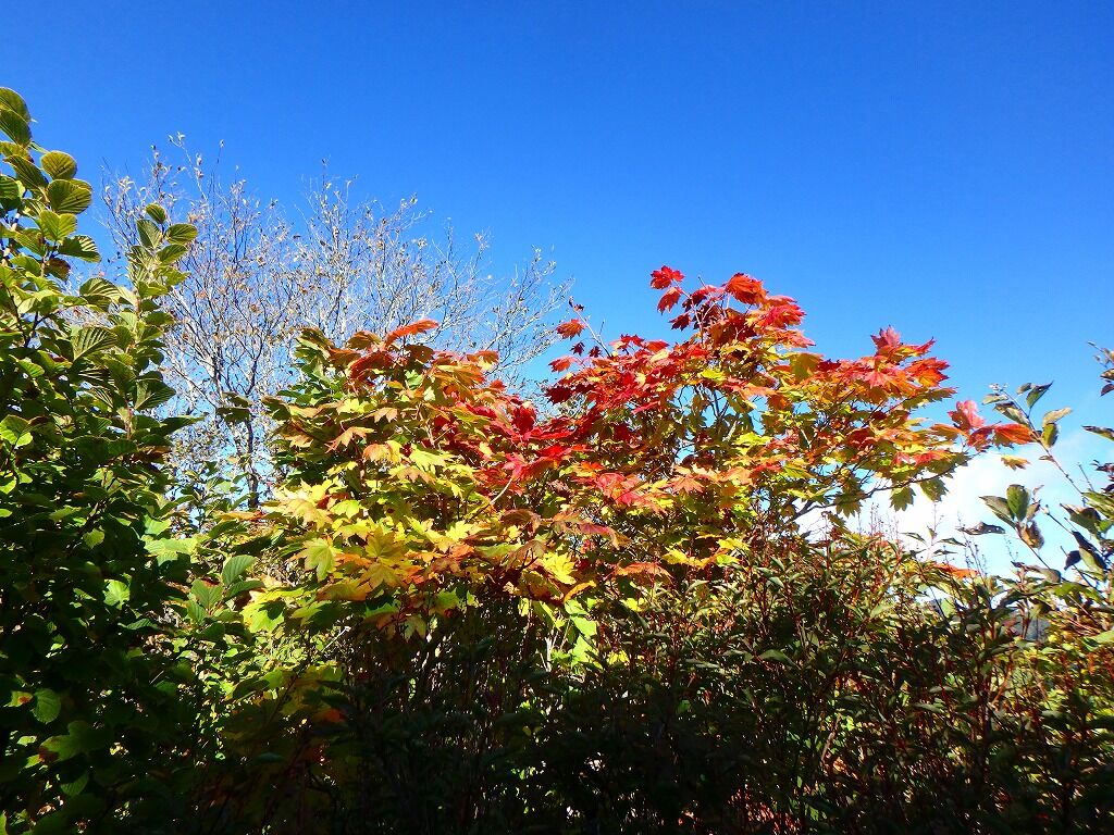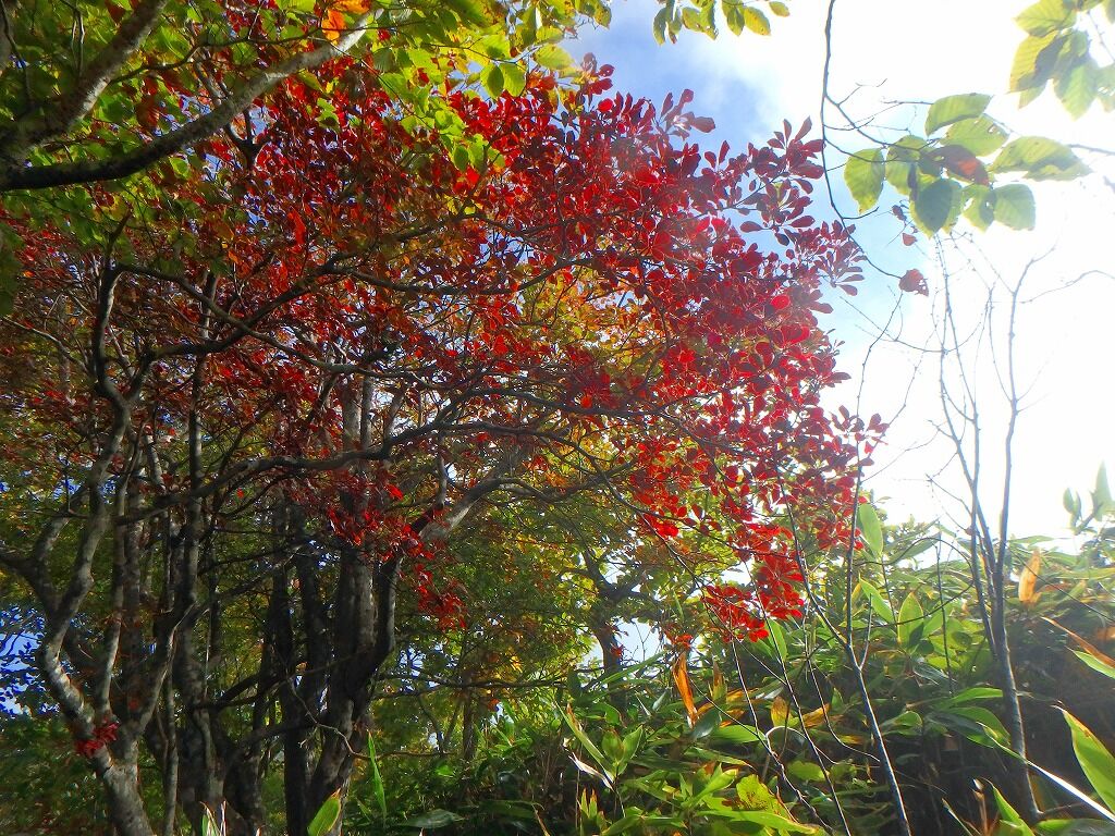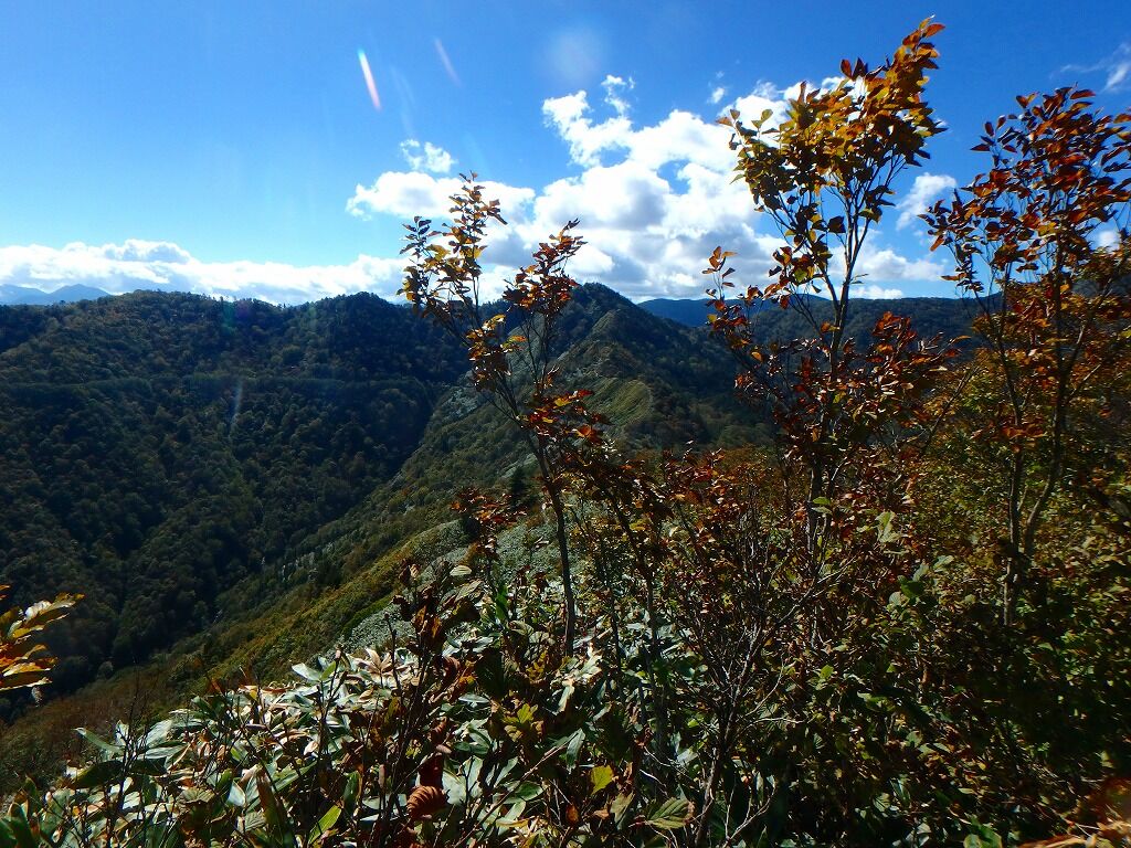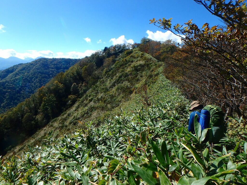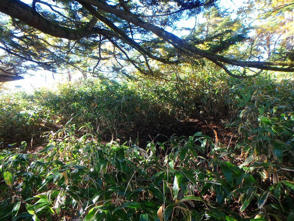 ちょいと針葉樹を潜り抜けて、背の低い笹と灌木にこれは隙ありと稜線上を歩く。