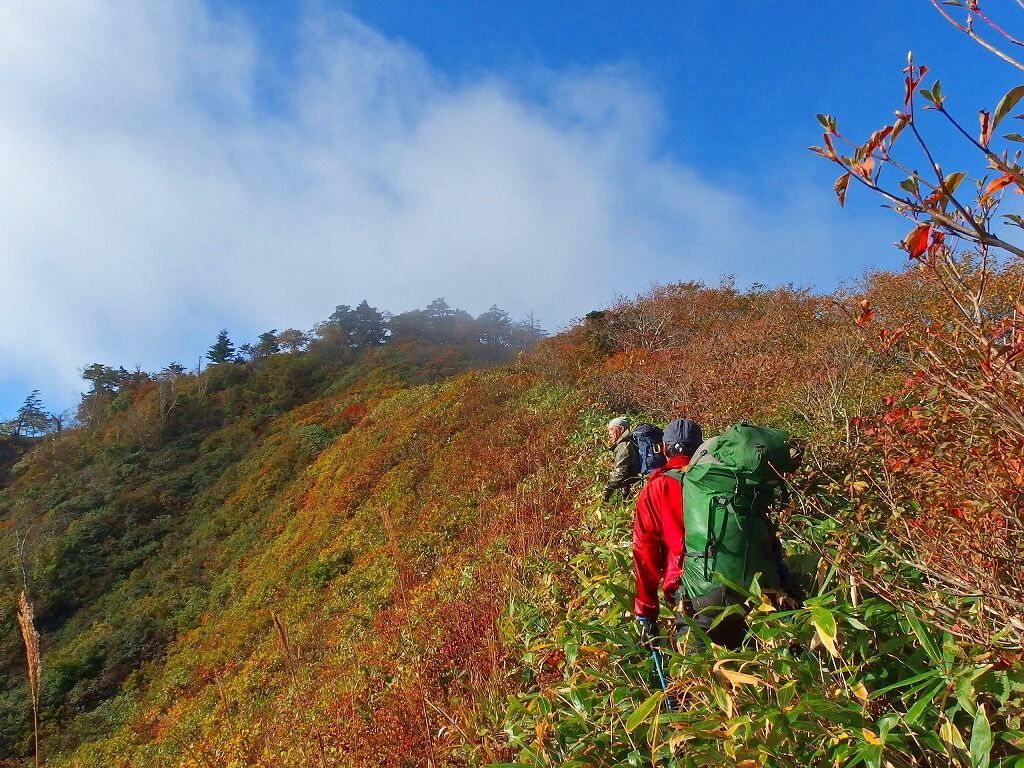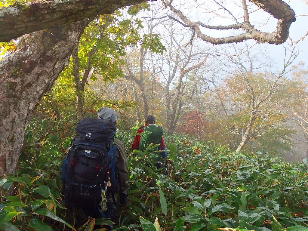 ともあれとりあえず素知らぬふりで話を聞いてみると、昨日の昼前に駅からタクシーで田代山登山口まできて、田代山峠からこちらに歩いてきたという。昨日は1600m鞍部付近に泊まったが何度か足がずり落ちたという。二泊三日で県境を安ヶ森峠まで抜ける予定だという。既に僕は通りし藪なので情報交換。