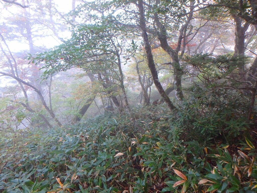 しかしようやくガスもすっきりしそうで、こうなったら展望のいい崖際でしょうと笹ラインを進んでいく。
