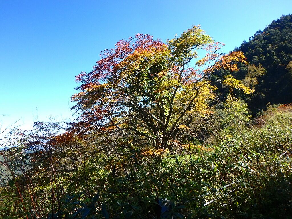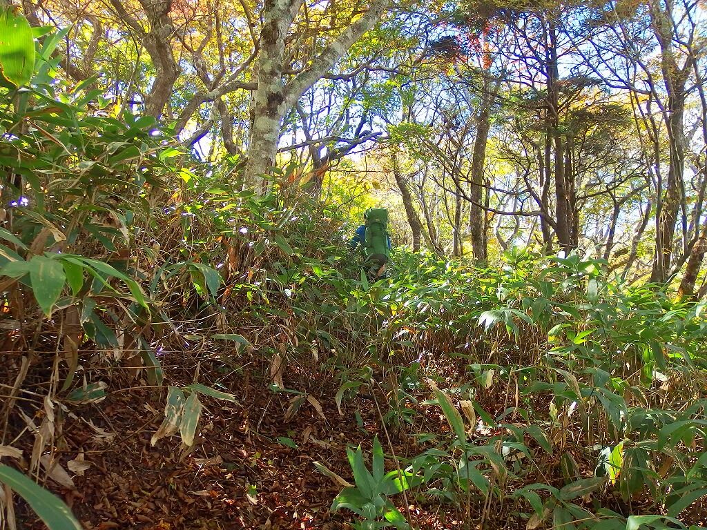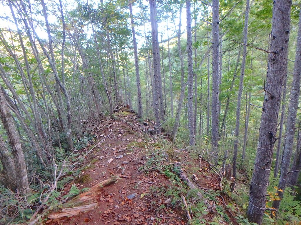 しかし尾根左サイドに明瞭な道型があり折角だからとそちらに降りてみるも、折れ曲がって道型は引き返していった。騙しやがってと舌打ち一つ尾根上に戻る。