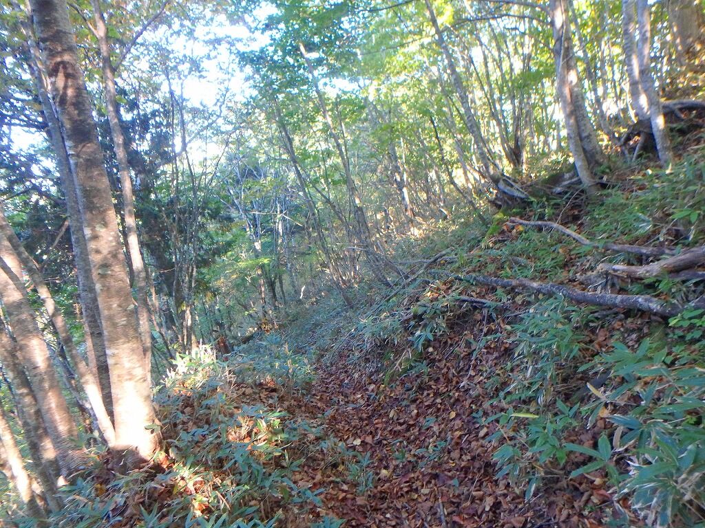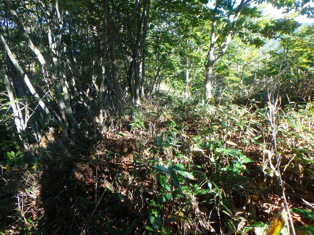 前方の小ピーク、灌木かき分けて登るの面倒だなと困ったら福島側の法則にしたがい北側に獣道を探ると、人工的な道型跡に飛び出て驚いた。