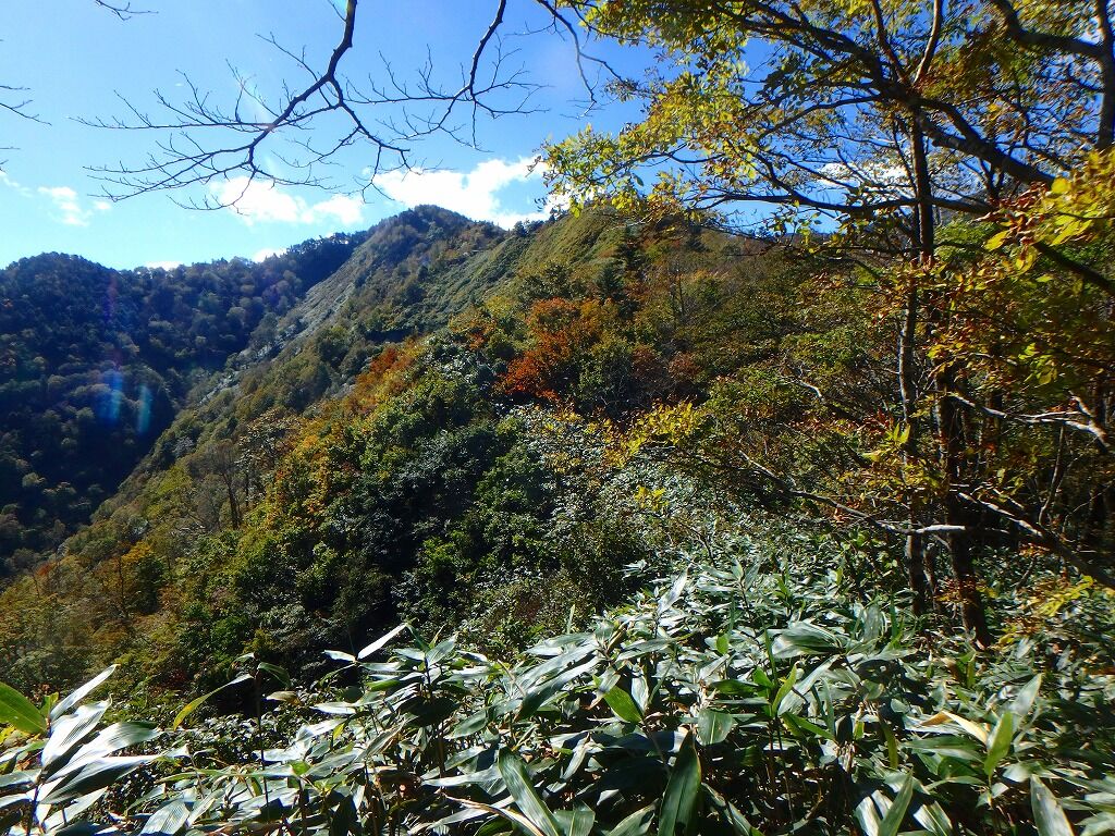 1535m地点くらいまで下りてきて、もはやお馴染みの崖際笹薮ラインとなる。
