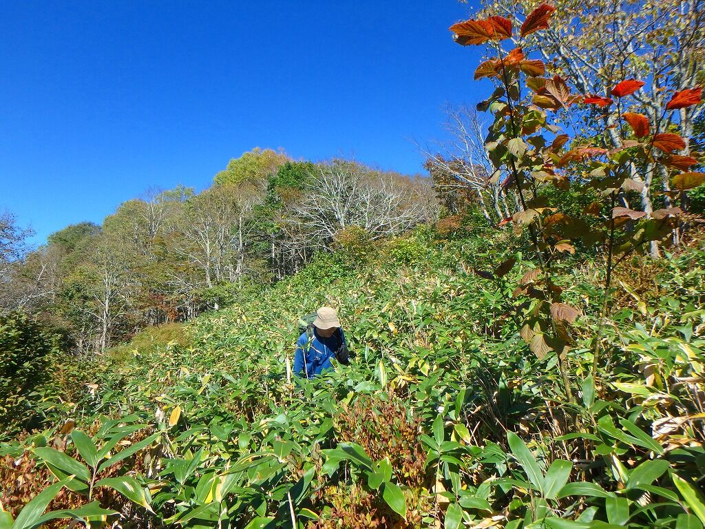 青空の下漕ぐ笹薮は気持ちがいい、なんてことはないが朝方の濡れ藪と比べたら快適。