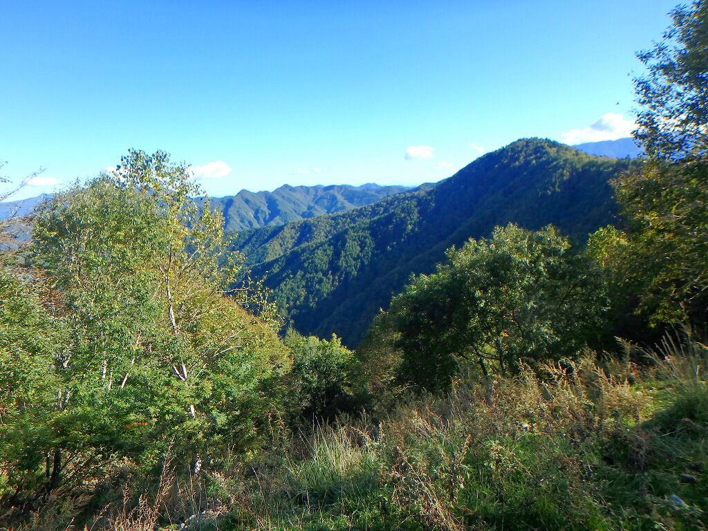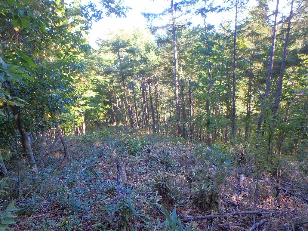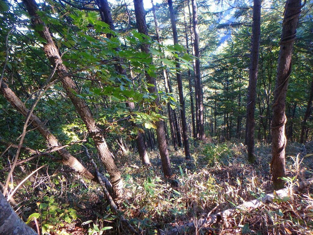 気づけば尾根右側は植林帯となっており、自然林との境が少し拓けている。ナゲ達はいつのまにかいなくなった。