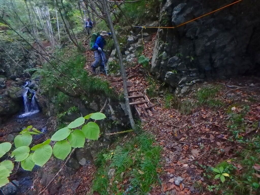 腐ってそうな木橋は跨いで渡る。振り向いたらさほど古くないロープが渡してあって、みー猫さんはそれを利用していた。林業の仕事経のようだ。