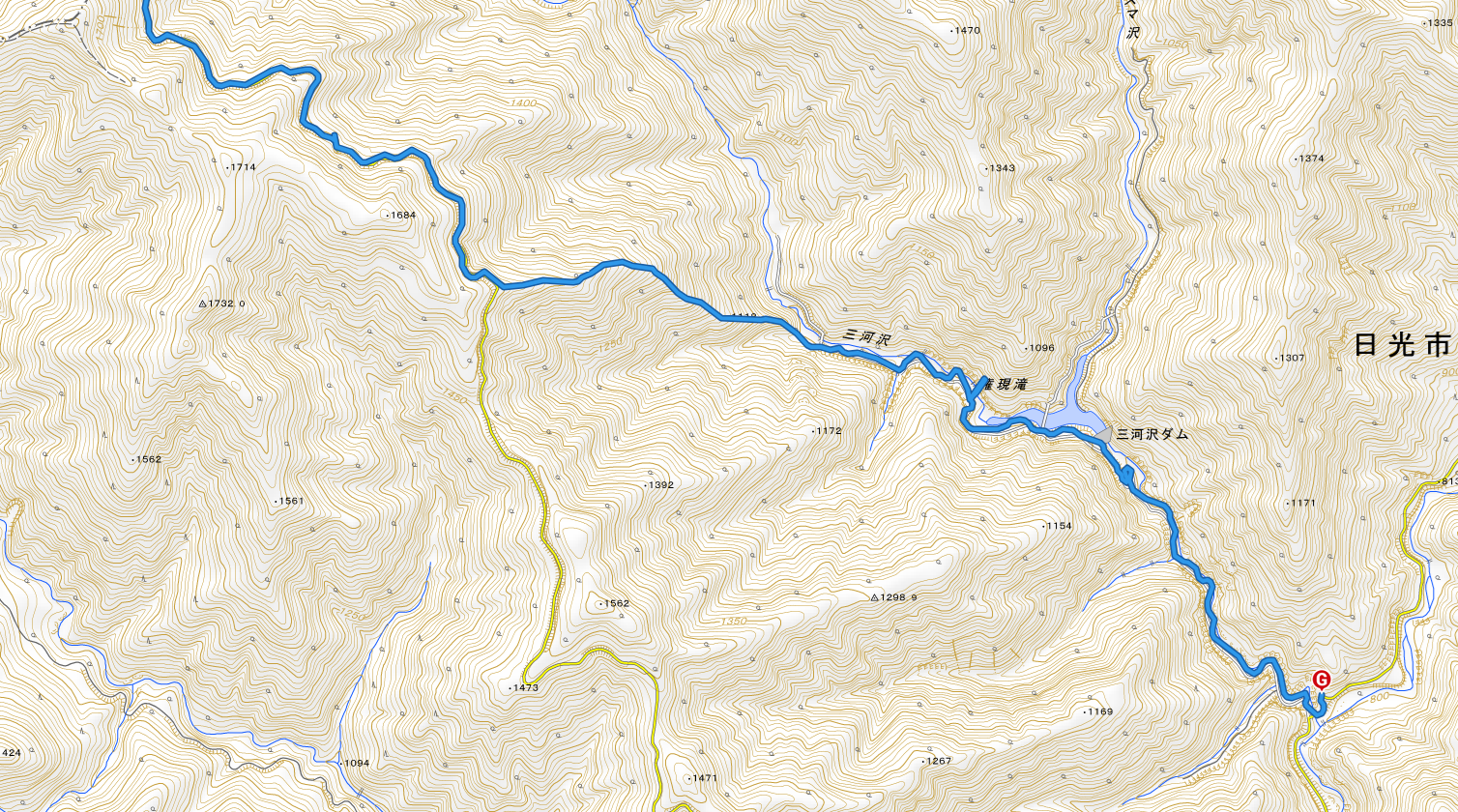三人そろってしばらくぶらぶら歩いていくと、地形図にも記載のある権現の滝にきたっちさんが興味を示す。