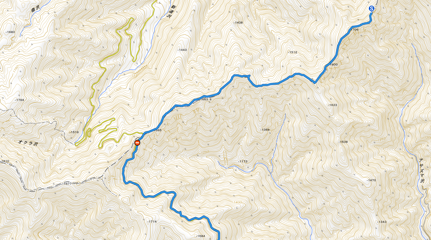 30分ほど歩いて13:20、1714m地点と1684m地点の中間点北側辺りの水場に到着。