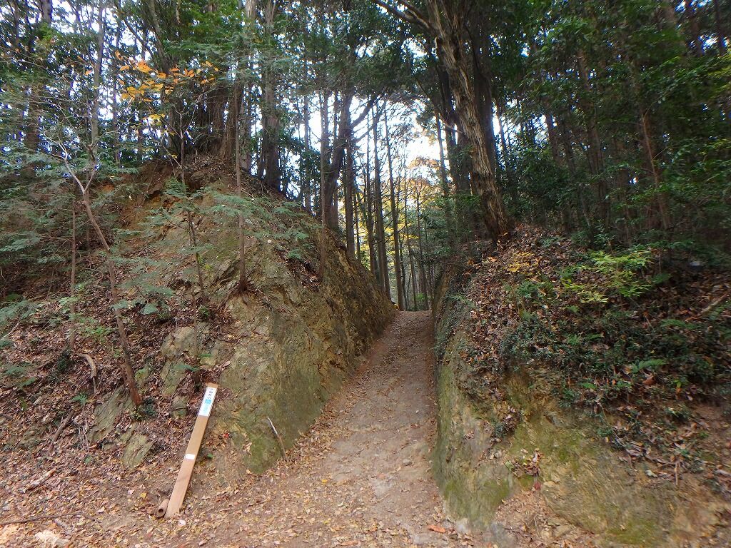 林道を横切り406mピークに向かうところは岩盤が削られ切通になっている。
