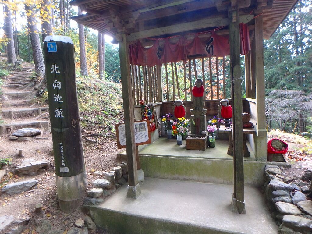 林道をぶらぶらと歩いていくと、13:24、377m地点に北向地蔵。